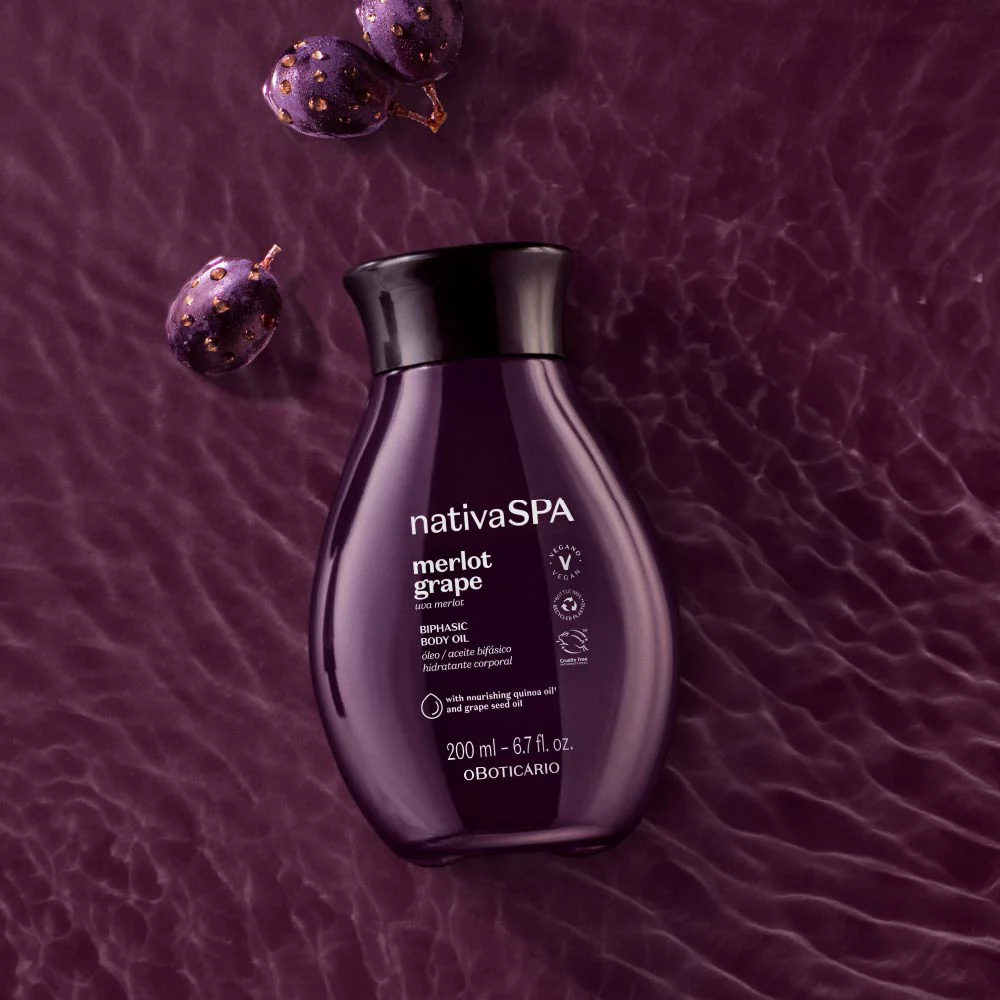 O Óleo Bifásico Hidratante Nativa Spa Uva Merlot realça o brilho natural da pele, deixando-a macia, suave, hidratada e iluminada.