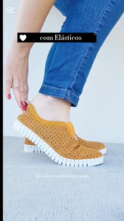 • A parte superior é feita em Pele macia e natural com bordados vazados para melhor respirabilidade dos pés e possui calce fácil em Elásticos.