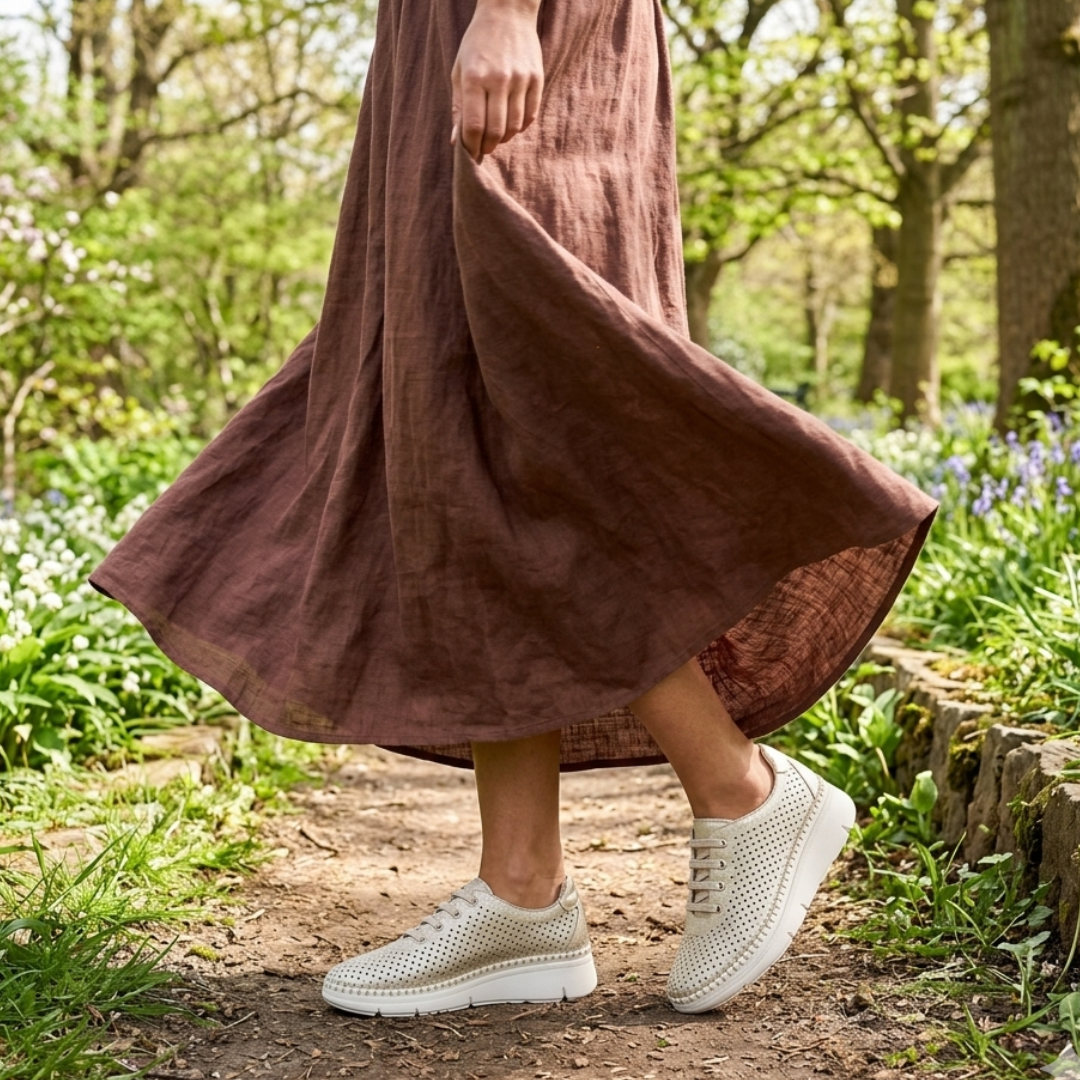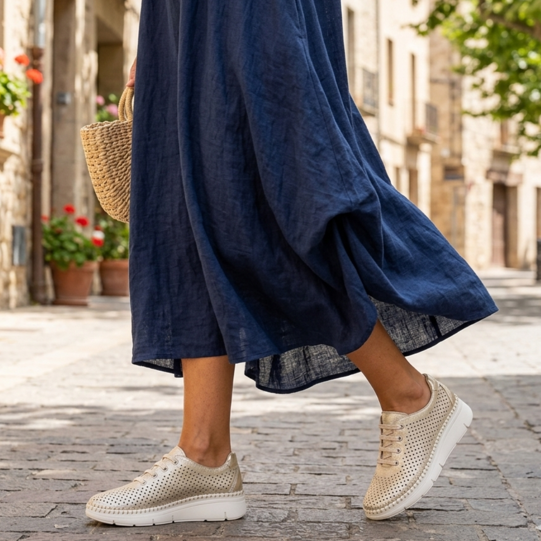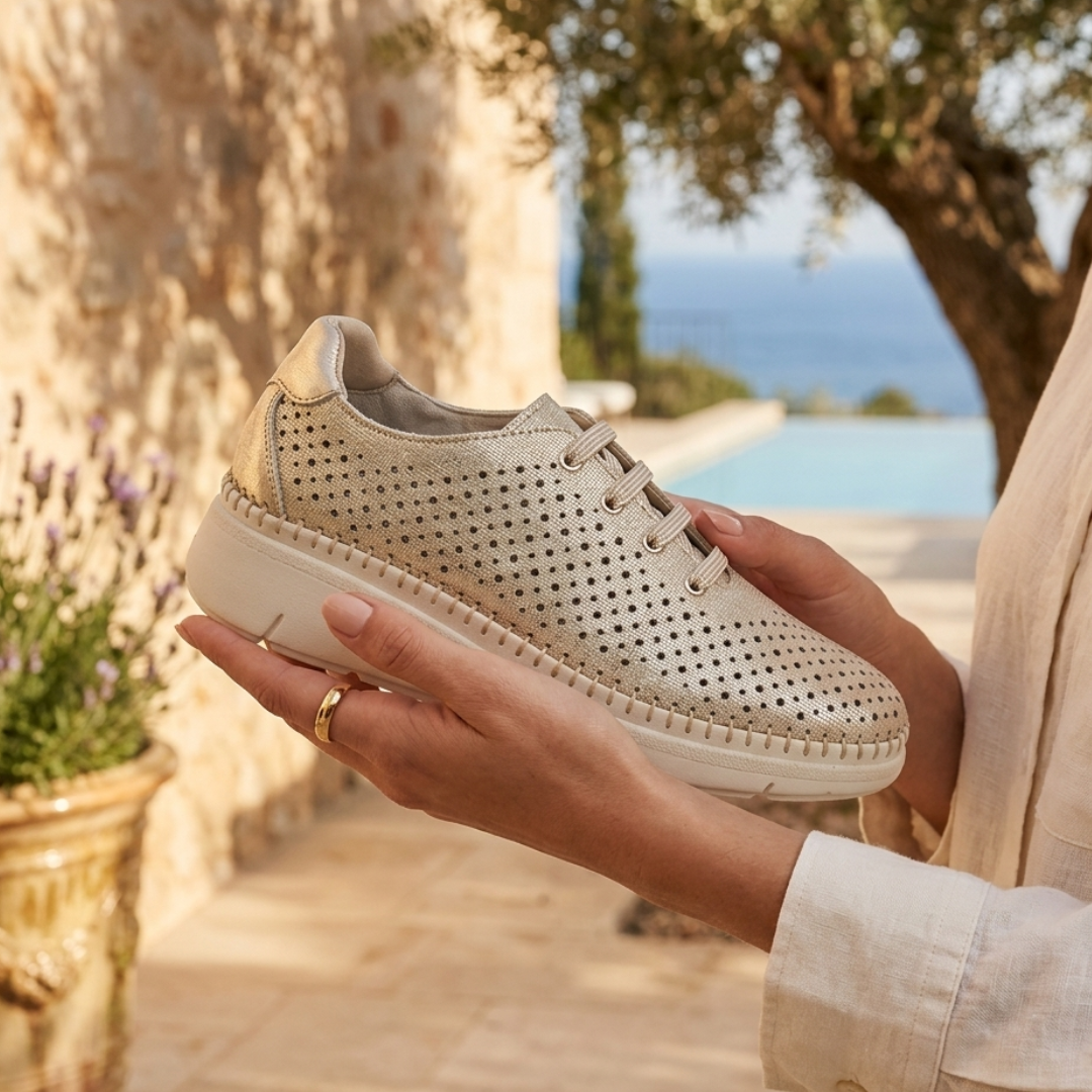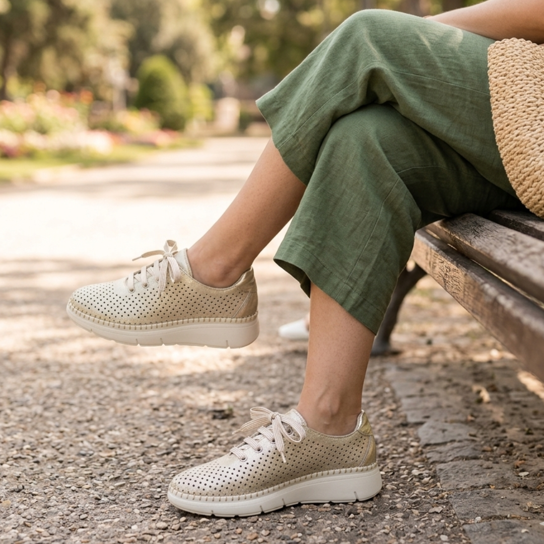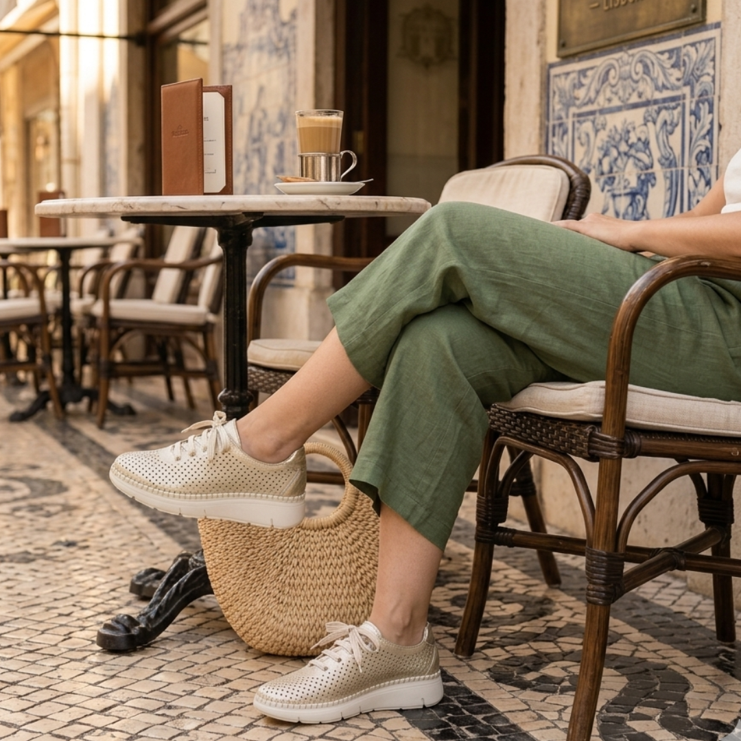 Diga adeus à dor ao caminhar. Estas sapatilhas em pele natural foram desenhadas para mulheres que sofrem de fascite plantar, esporão de calcâneo ou que passam o dia de pé. Com fabrico artesanal português, este modelo adapta-se à ergonomia do seu pé, protegendo as articulações e a coluna a cada passo.